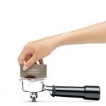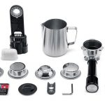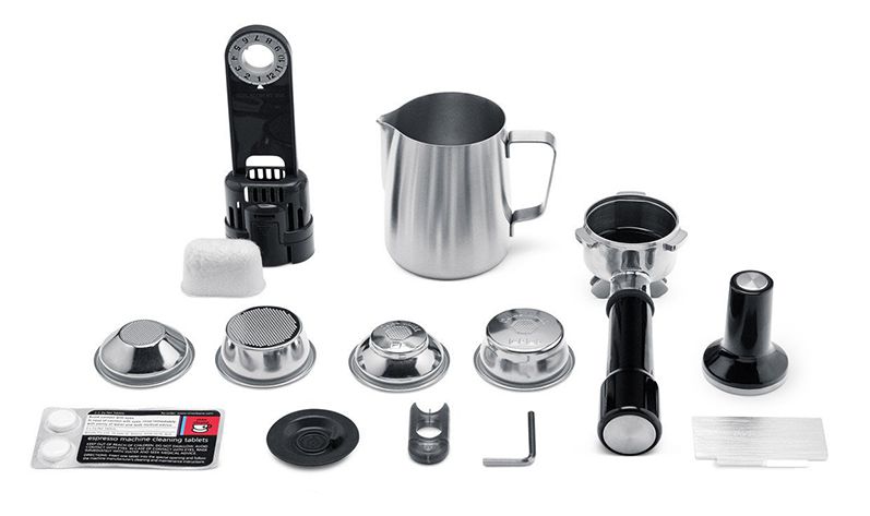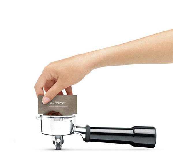 - The machine also comes with a charcoal water filter of standard coffee maker size, a tamping tool that can be integrated or handheld, a measuring spoon, and a stainless steel frothing jug. Finally, it also features a razor dose trimming tool, which is just a fancy flat card tool to slice off extra grounds from the top of the filter.
